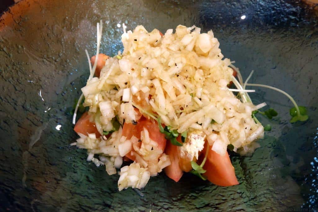 - ソース作り:玉ねぎを10分以上は水にさらしておく。水を切って、他の材料と混ぜる。分量は好きにしてくれ。