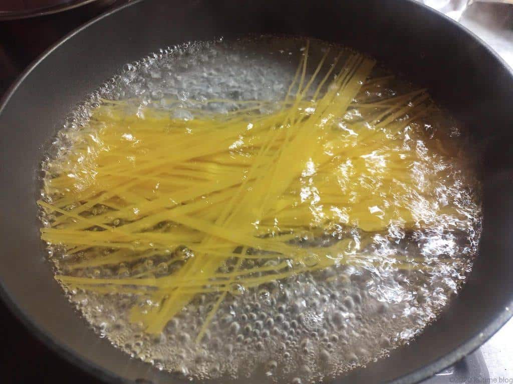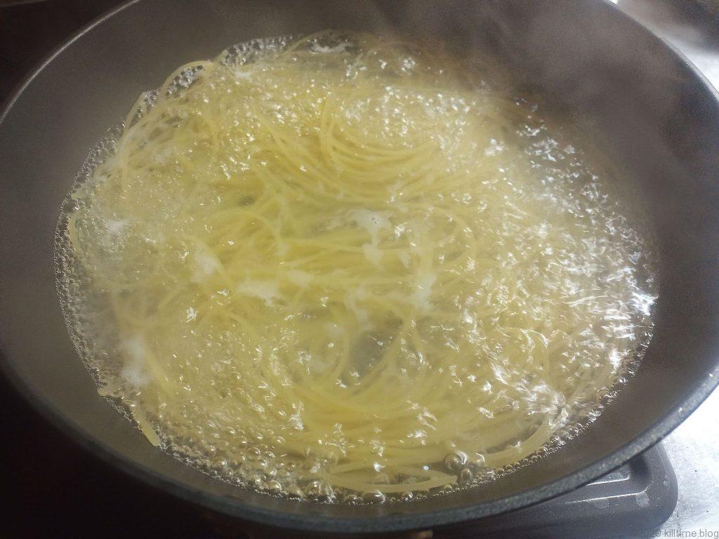 - 塩(分量外)を湯に加え、麺を6分茹でる