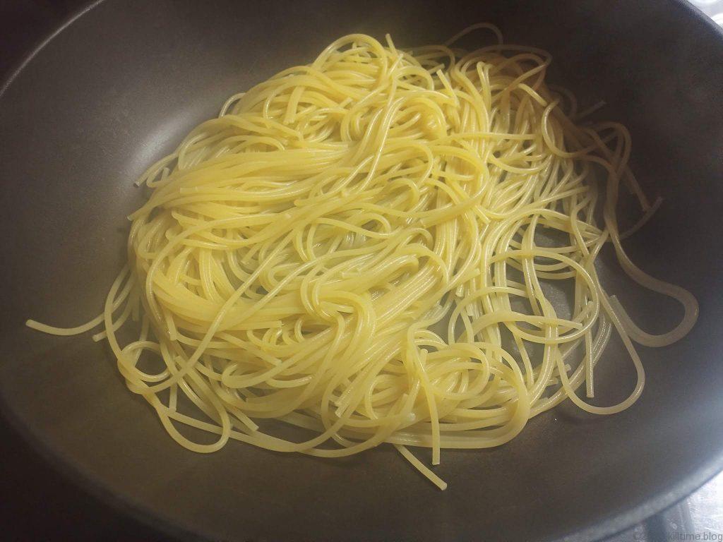 - フライパンを湯切りする。カップ焼きそばのように。麺を落とさぬよう上手に。