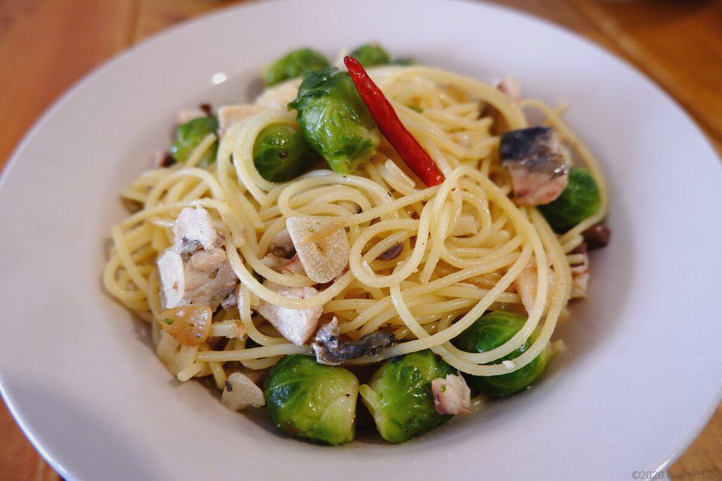 キャベツとアンチョビのパスタがあるんだから、芽キャベツと鯖のパスタというのはどうでしょう、って感じでしょうか。