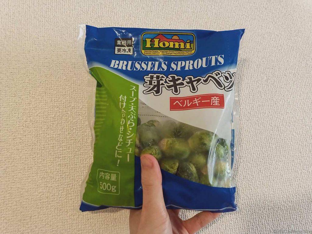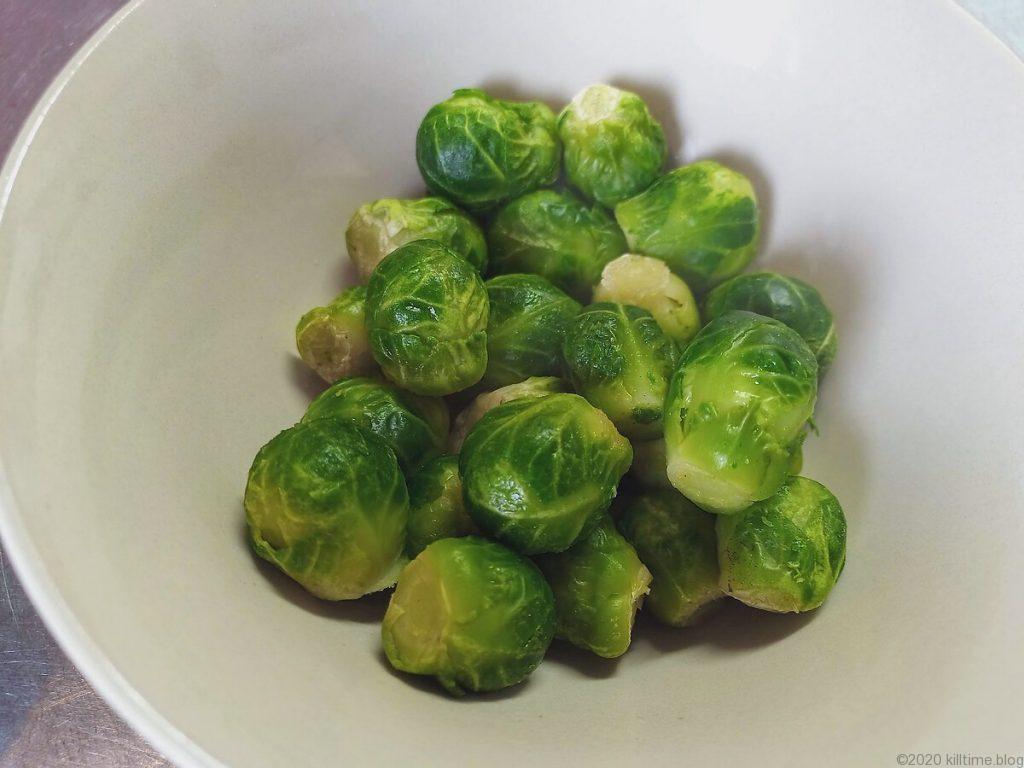 冷凍の芽キャベツ、結構やるねぇ〜水っぽかったりパサついたりするのかなぁと思いきや、食感はしっかりキャベツです。蒸してホクホクした感じになっています。