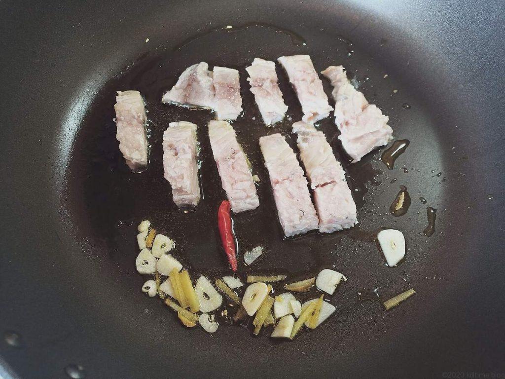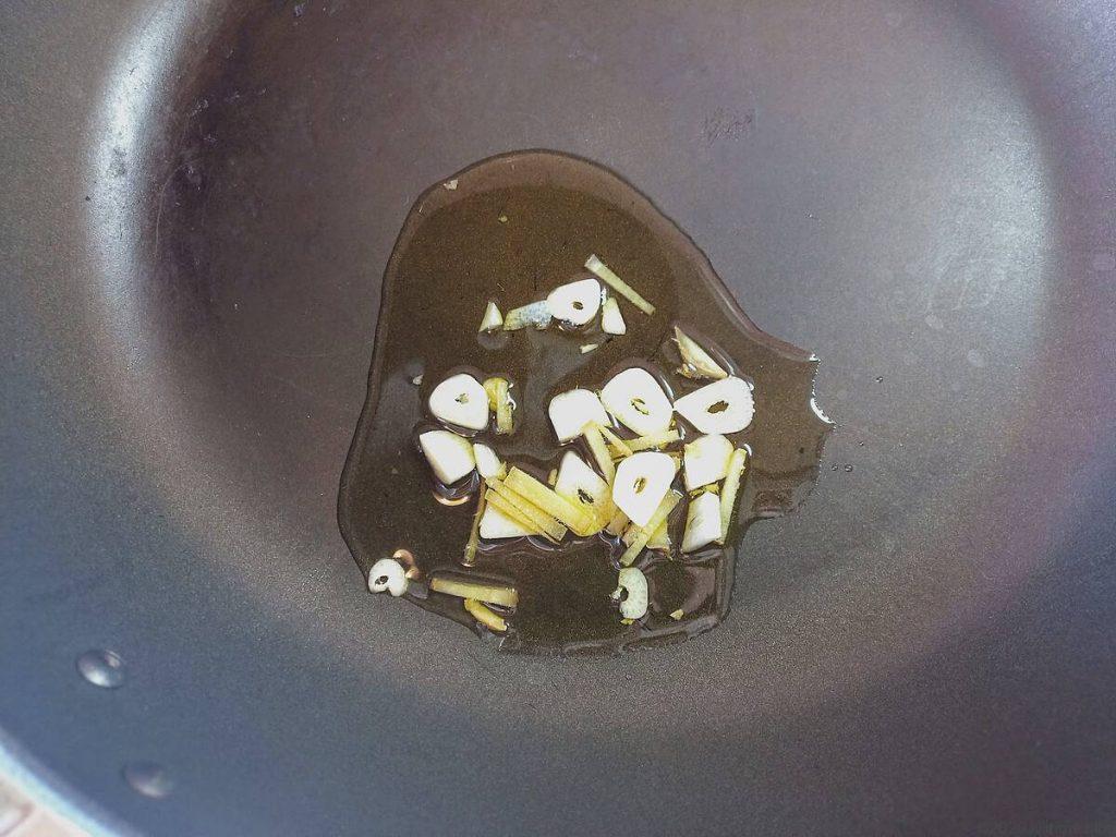 - 生姜とにんにくを炒めます。あと本当はこの時点で鷹の爪を入れたかった。