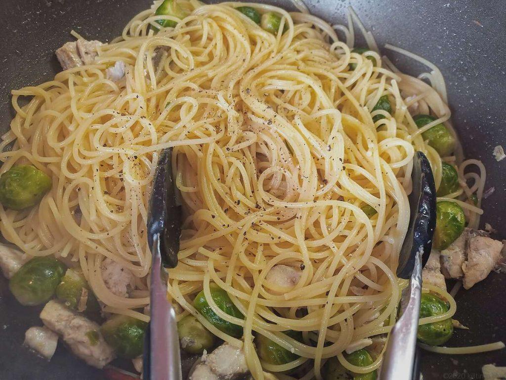 - 麺の茹で汁を少し加え、茹でた麺を加え、混ぜ、塩コショウで味を整えます。完成。
