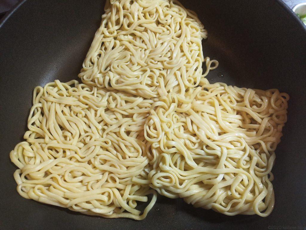 - 麺をフライパンで焼く。強火のまま、3分ぐらい。動かさない。フライパンやコンロによっては5分位かかるので、上手く見極める。