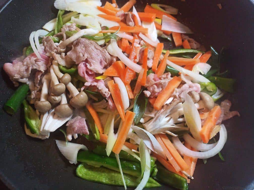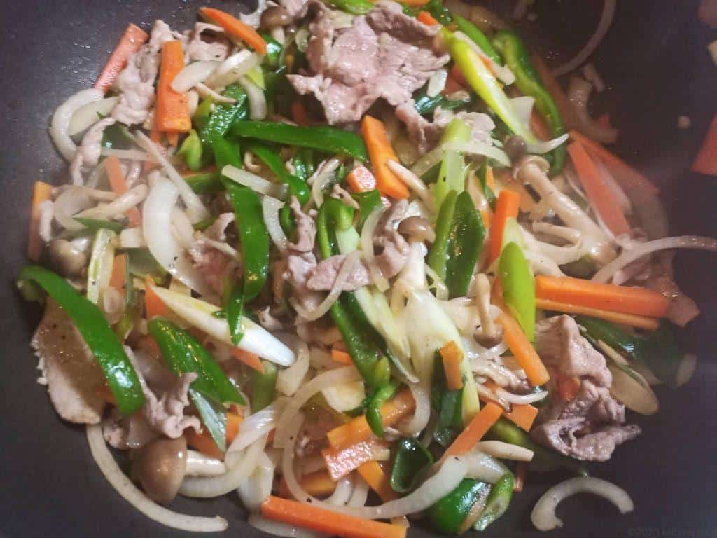 肉と野菜を炒める