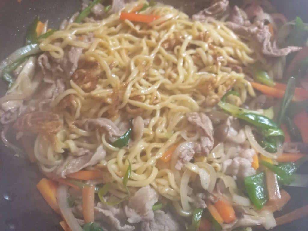 - 具を炒めているフライパンに、先ほど皿に上げておいた麺を加える。