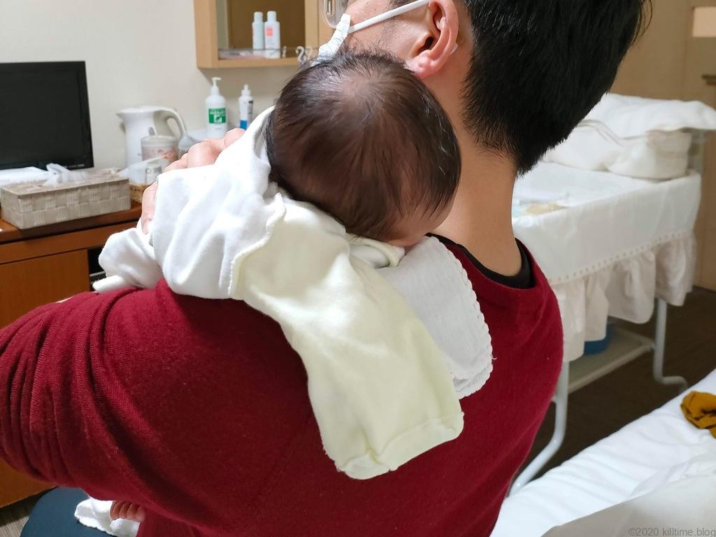 抱っこも首が座っていないので全て親の力で支えることになる。自力でしゃんとしてくれない。すべてがままならぬ存在である。体重は3kg程度だが、体重のわりに抱っこしていると疲れる。抱っこする側の人間が姿勢をちゃんとしないと肩と腰が死に、腱鞘炎になる。