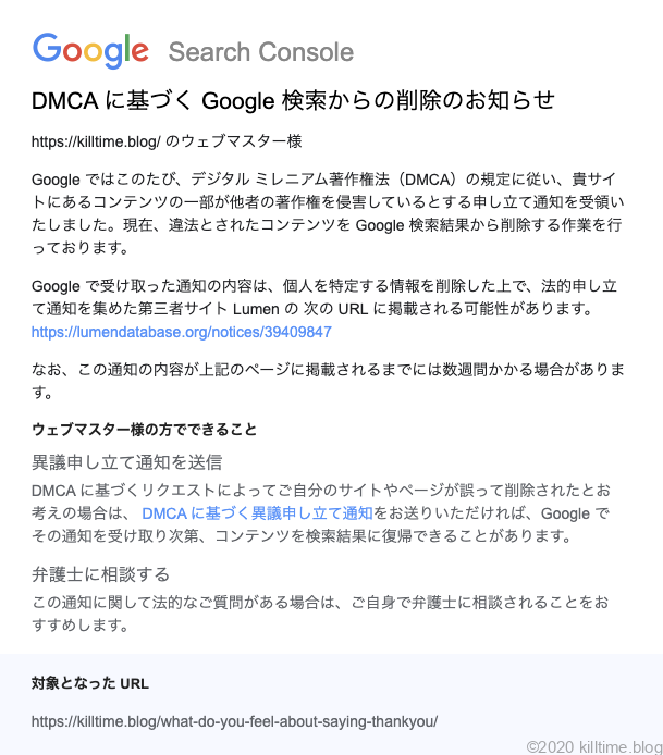 ある日突然、Googleから「DMCAに基づくGoogle検索からの削除のお知らせ」なんてメールが来て、記事がGoogleの検索結果に表示されなくなってしまいました。