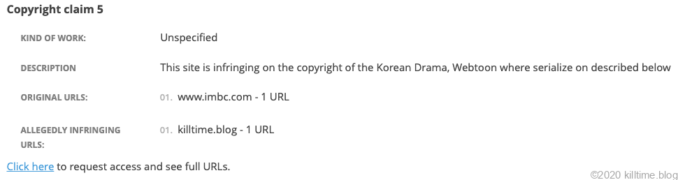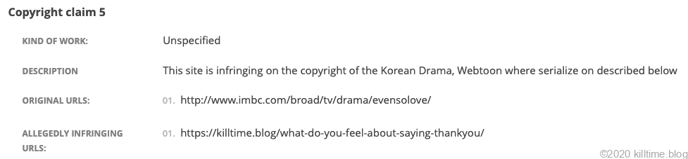 削除対象のコンテンツは、所有者自身が考えたことを書き記したエッセイであり、当該DMCA Complaint (https://lumendatabase.org/notices/39409847 – Copyright claim 5)におけるORIGINAL URLSのいずれのページの内容にも一切関係がないものである。このことから、SENDERの主張する”This site is infringing on the copyright of the Korean Drama, Webtoon where serialize on described below”といった事実は全くなく、当該DMCA Complaint自体が誤りであるため。