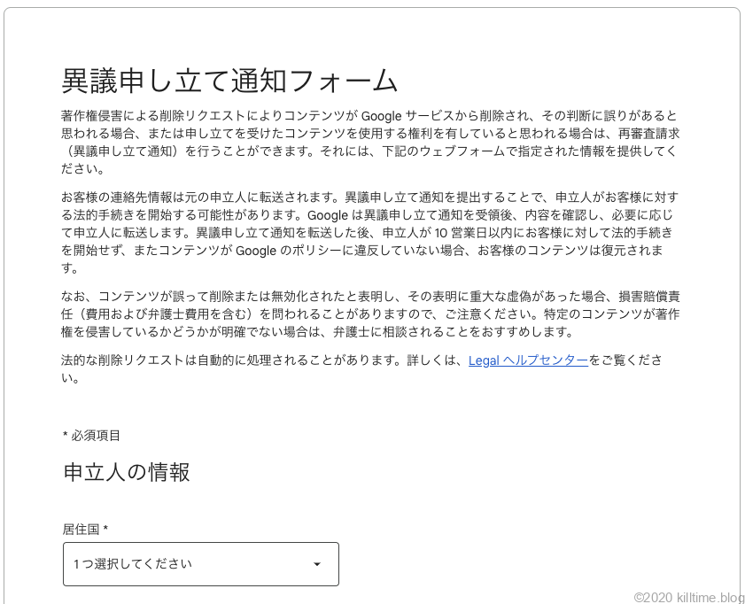Googleからのメールに記載されている、異議申し立てのためのWebページにアクセスする。こちら。
