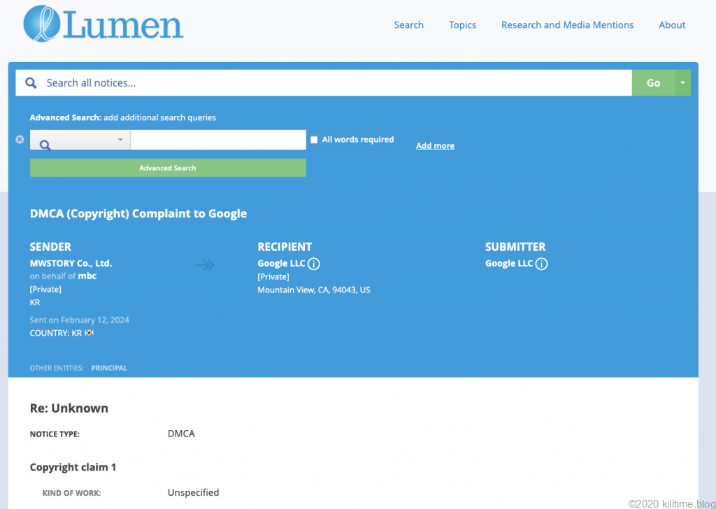 Google で受け取った通知の内容は、個人を特定する情報を削除した上で、法的申し立て通知を集めた第三者サイト Lumen の 次の URL に掲載される可能性があります。 https://lumendatabase.org/notices/39409847