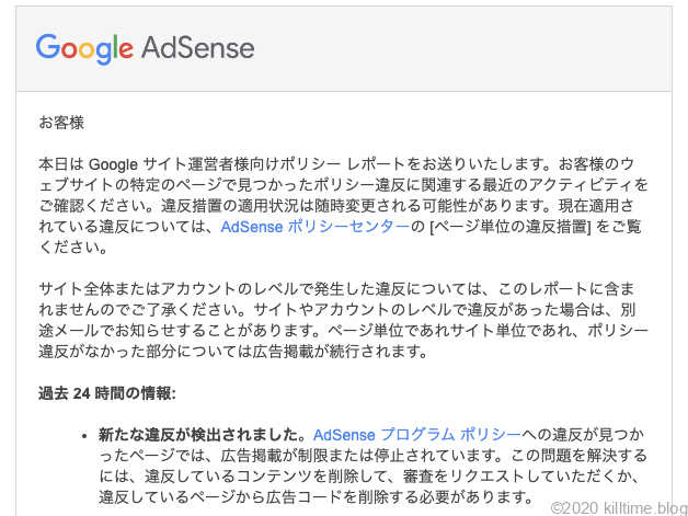| 2024.2.15 | 「AdSense サイト運営者向けポリシー違反レポート」のメールを受信 |