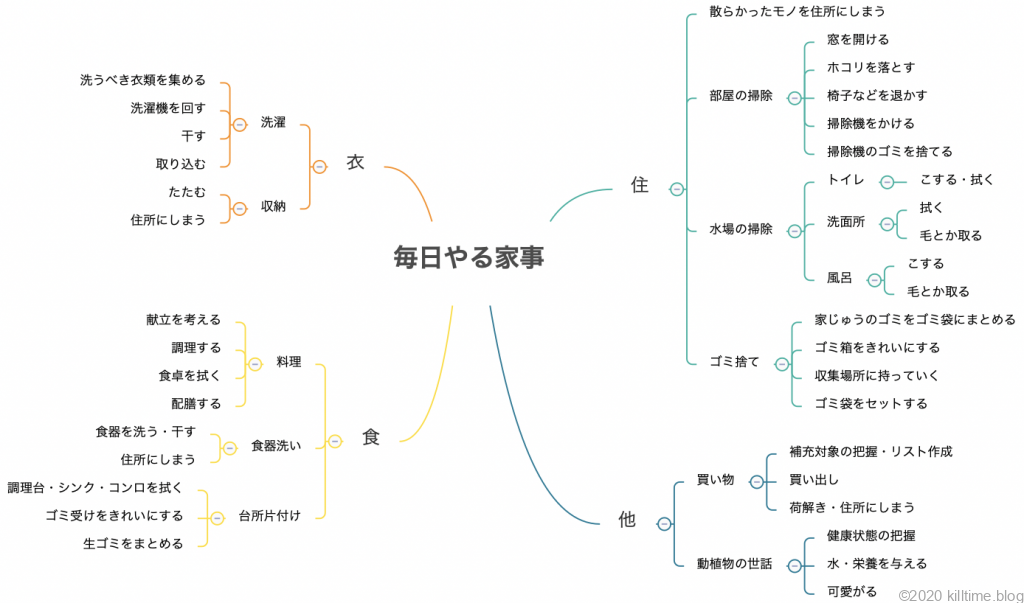 マインドマップは「毎日やる家事」と銘打ってあるのだが、実際のところは週末にまとめて行えることとか、毎日やらなくても死なないことが多い。